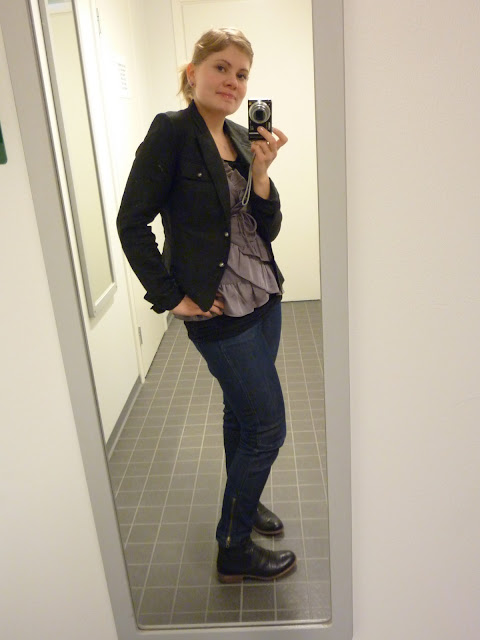 Bleiseri/ Lindex, farkut/ Lindex, musta toppi/Spirit Store, laventeli röyhelötoppi/ Objeckt, kengät/Andiamo.